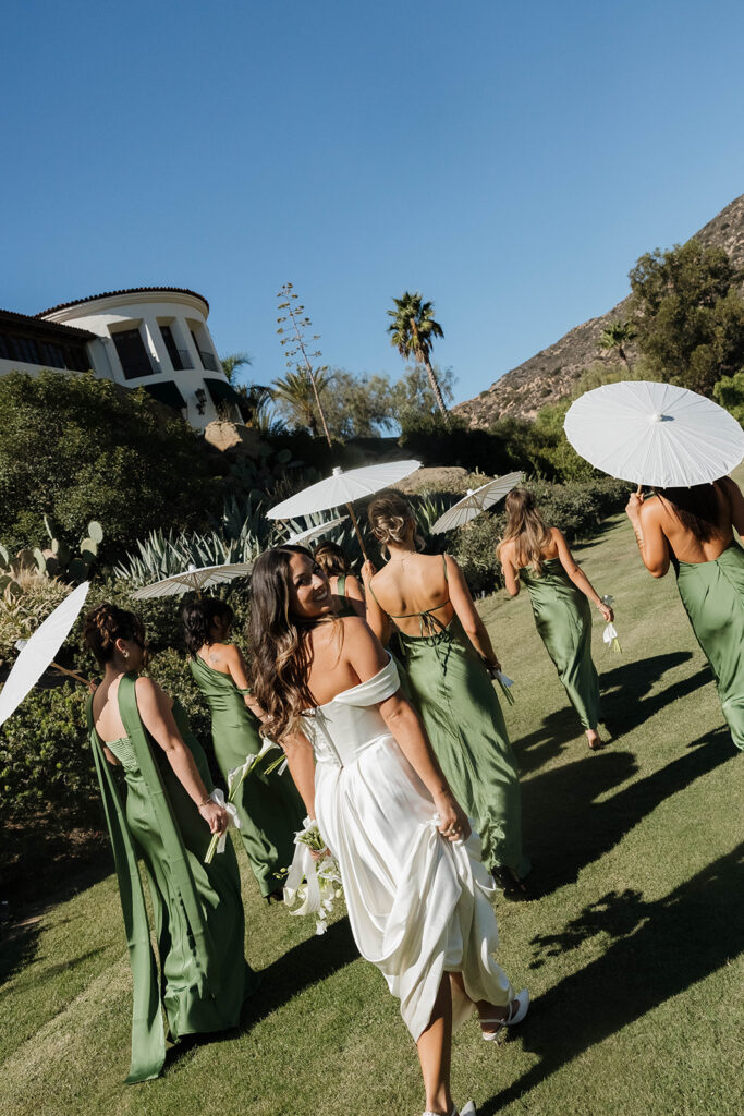 The villa’s interior is genuinely one of a kind. Exposed wooden beam ceilings, terracotta tile floors, and old stone walls photograph beautifully and give the getting-ready portion of the day a warmth that a standard bridal suite just can’t replicate. Jordan’s bridesmaids wore earthy chocolate satin sets in the morning, relaxed and happy as they helped her get ready for the day.